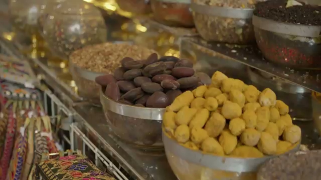 A close-up view of vibrant spices at a Dubai souk, featuring yellow turmeric roots, dark dried seeds, and other fragrant ingredients in metal bowls.