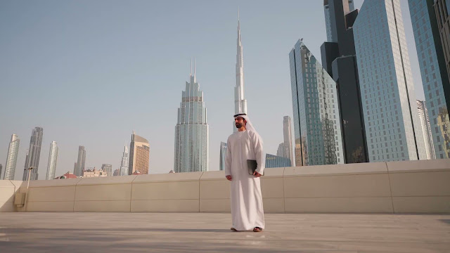 An Emirati man in a white kandura walks with the iconic Burj Khalifa rising behind him, blending heritage and modern ambition.