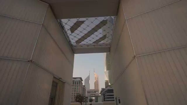 A creative perspective of Dubai’s skyline seen through a modern architectural corridor with patterned roofing. The framing highlights the contrast between contemporary structures and iconic skyscrapers in the distance.