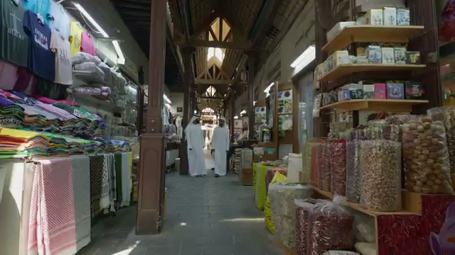 Two Emirati men dressed in traditional white kanduras walk through the Dubai Souk, passing stalls with colorful fabrics, spices, and goods on display under the wooden roof. A cultural glimpse of everyday heritage in the UAE.