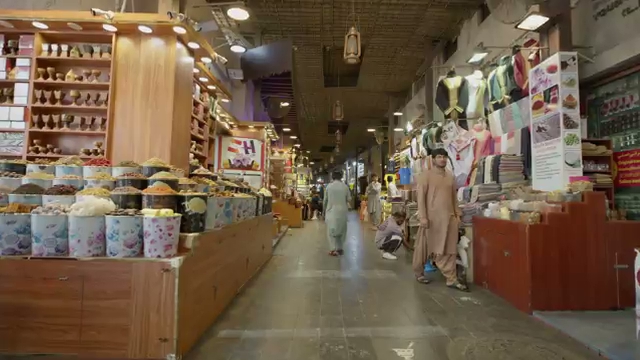 A lively Dubai souk corridor with spice stalls, textiles, and shoppers walking through the traditional market.