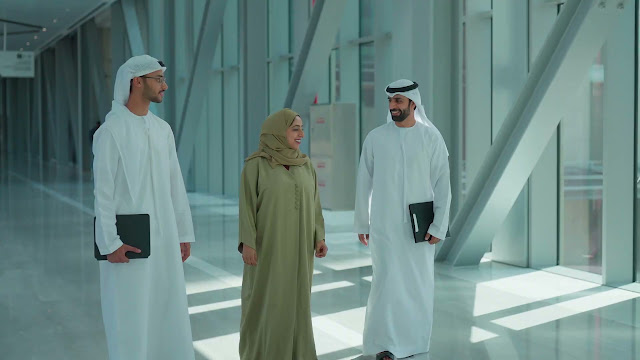 A group of Emirati professionals walks together through a bright, modern office corridor, engaged in conversation. Their traditional attire contrasts elegantly with the sleek architectural design, symbolizing the harmony between Emirati heritage and