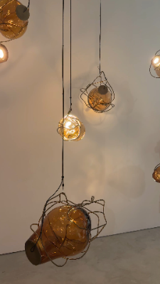 A collection of modern, artistic pendant lights with wire frames and amber glass, hanging from the ceiling against a plain wall.