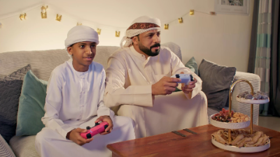 Between friendly competition and cheerful banter, an Emirati father and son build memories during their evening gaming session.