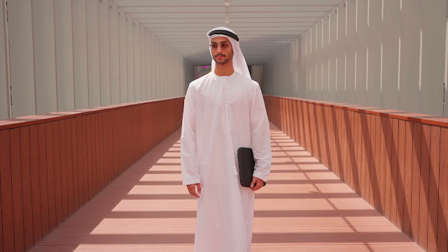 An Emirati man dressed in a crisp white kandura stands confidently in a sun-drenched corridor, holding a black portfolio. The symmetrical design and warm tones of the wooden panels create a powerful visual that blends cultural tradition with modern m
