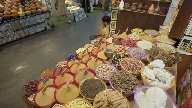 An overhead view of assorted spices, herbs, and dried goods arranged in colorful bowls at Dubai’s traditional Spice Souk. A vibrant scene reflecting the rich flavors and culture of the UAE.