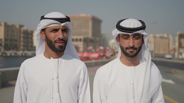 Two Emirati men dressed in traditional kanduras and agals walk along a city waterfront, with UAE flags and buildings in the background on a sunny day.