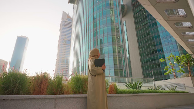 An Emirati woman in a beige abaya walks alongside towering glass buildings, holding a folder and framed by early morning sunlight.