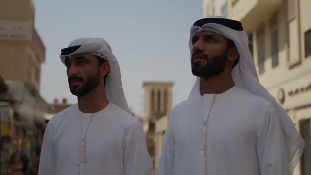 Two Emirati men in traditional white kanduras and ghutras walk together in Old Dubai, with heritage-style wind towers and narrow streets in the background.