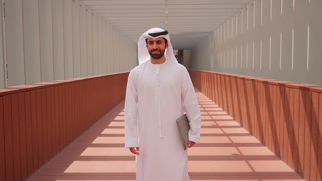 An Emirati man in a white kandura walks confidently across a modern architectural bridge, holding a laptop in one hand.