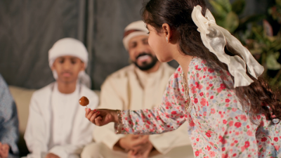 A small Emirati family consisting of father, mother, young son and daughter gather after Iftar for precious family time. The young daughter is shown enjoying traditional Emirati sweets called louqaimat.