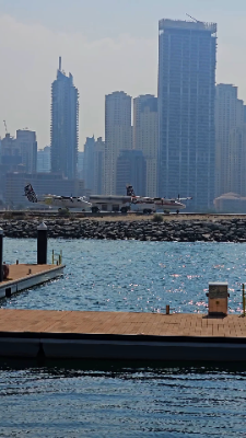 A video showcasing the action in Dubai Harbor as boats pass by while the helipad and aircrafts are also visible.