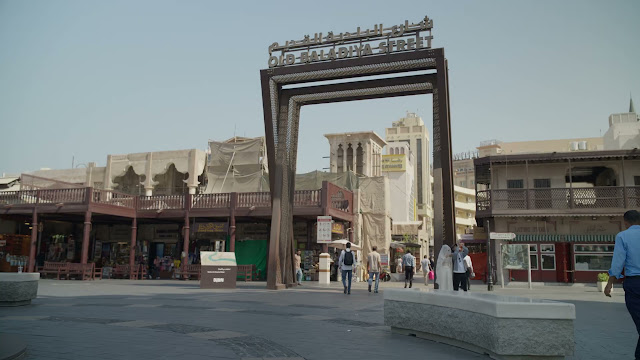 The iconic entrance to Old Baladiya Street in Dubai, surrounded by traditional architecture, market shops, and visitors exploring the historic district under clear blue skies.
