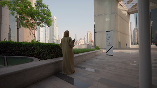 An Emirati woman in abaya walks along a modern path, holding a folder as she approaches the Dubai skyline in the golden light.