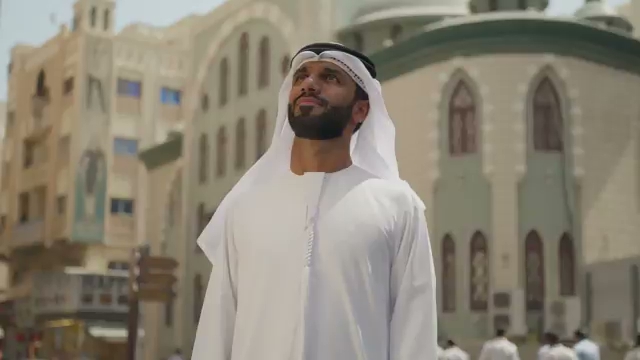 An Emirati man wearing a white kandura and black agal stands outside a mosque in Deira, Dubai, with its domes and arched windows in the background.