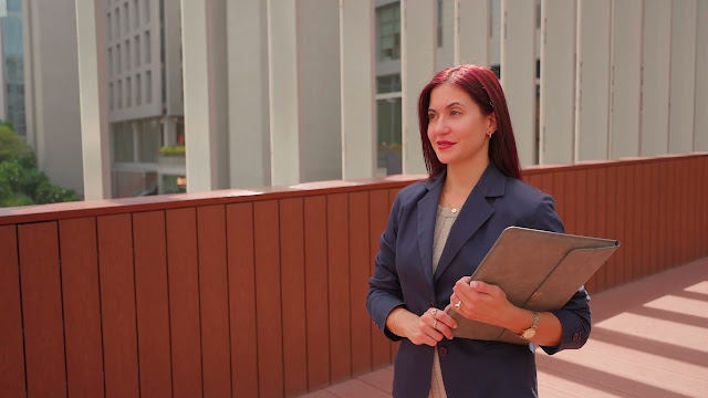 A confident woman in a navy blazer stands outdoors in a modern urban setting, holding a laptop sleeve and looking ahead with a poised expression under warm sunlight.