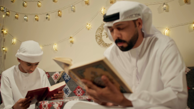 A video of an Emirati father leading his son in prayer and Quranic reading, passing down knowledge.