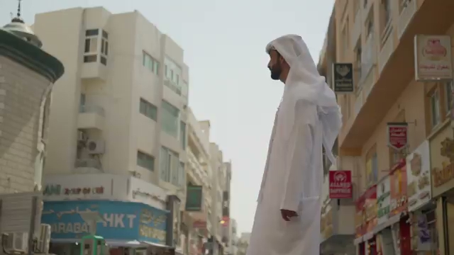 An Emirati man in a white kandura and ghutra walks through the bustling streets of Deira, Dubai, surrounded by shops and old-style buildings.