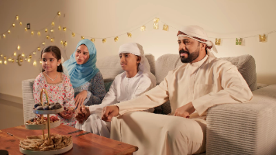 The best memories are made at home—an Emirati family enjoys a relaxed and happy night together in front of the TV.