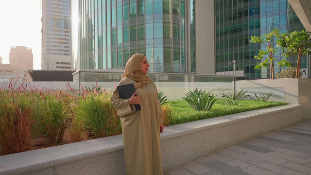 An Emirati woman in a beige abaya walks with a folder in hand, smiling as she passes a manicured garden and glass towers.