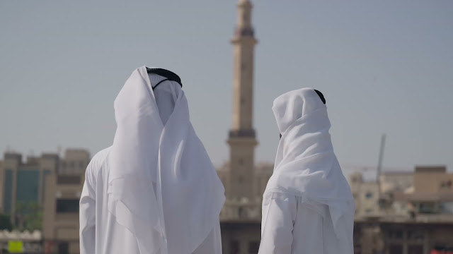 Two Emirati men in white kanduras and ghutras stand side by side, facing a tall mosque minaret, with the city skyline and clear blue sky in the background.