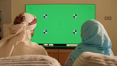 An intimate and relaxing moment as an Emirati husband and wife talk and watch TV, enjoying their time together.