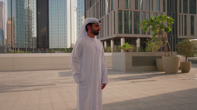 An Emirati man in traditional kandura stands confidently in a modern business district, surrounded by sleek towers and greenery.