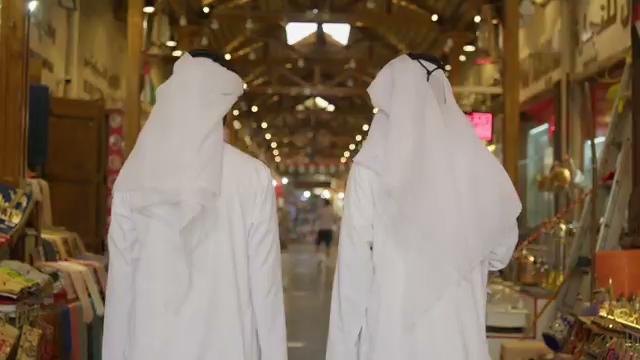 Two men in traditional Emirati attire walk through the bustling Dubai souk, surrounded by vibrant shops and golden lights.