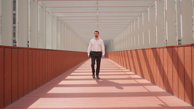 A man in a white shirt and black pants walks confidently down a sunlit covered walkway, carrying a laptop sleeve, framed by modern architectural beams and shadows.