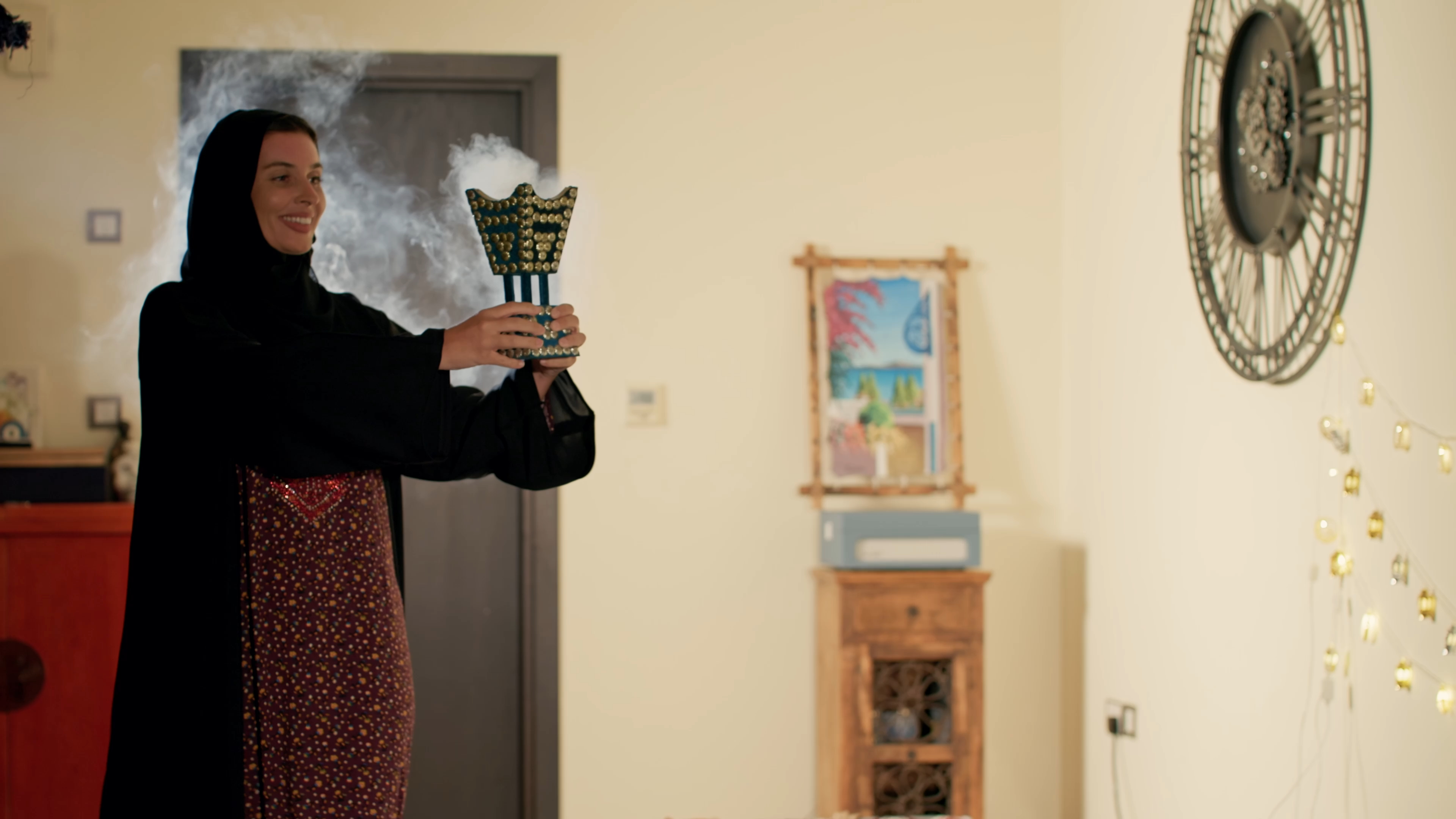 A young emirati woman walking around her house in traditional clothing while burning Incense and holding a traditional incense burner.