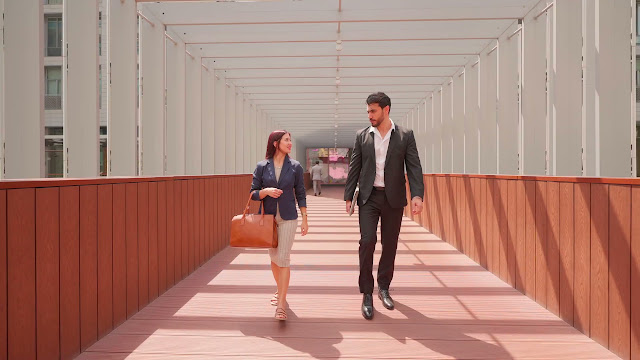 A man in a suit and a woman in casual chic walk and talk across a bright modern bridge, blending business with ease and connection.