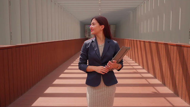 A confident woman in a navy blazer and grey dress walks through a sunlit, modern corridor, holding a laptop sleeve and looking to the side with a poised smile.