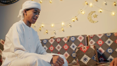 An Emirati father and his son sit together playing a board game, laughing and enjoying screen-free bonding time.