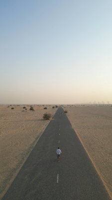 A person walking dramatically in the middle of nowhere surrounded by desert sand.