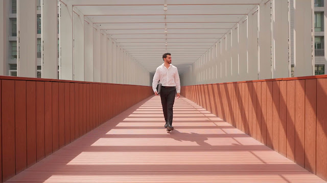 A man in a white shirt and black pants walks confidently through a bright, covered walkway, holding a laptop sleeve, surrounded by modern beams casting striking shadows.