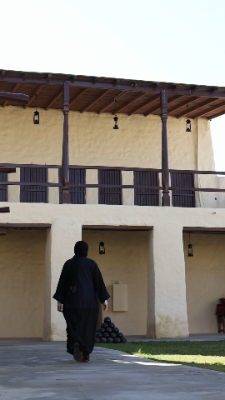 Emirati woman walking past a traditional house
