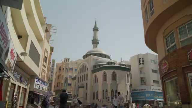 A beautiful mosque with a tall minaret stands at the heart of a busy Old Dubai street, surrounded by shops, hotels, and daily life in the city.