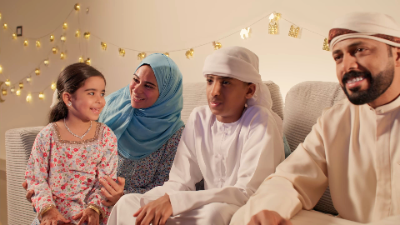 An Emirati family gathers on the couch, watching TV together and sharing laughter, making the most of their time in Ramadan.