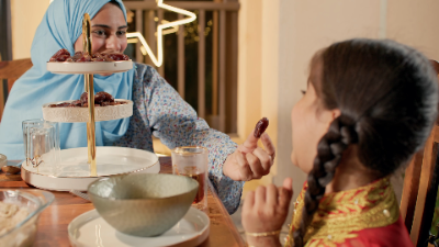 An Emirati mother offers her young daughter a date while they break their fast during Ramadan.