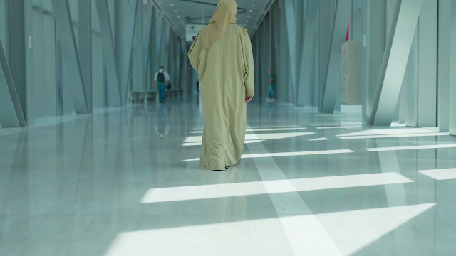Emirati Woman Walking Through Modern Office Corridor