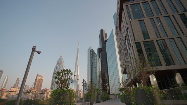 A view of Dubai International Financial Centre (DIFC) with the Burj Khalifa and surrounding modern skyscrapers. The scene highlights Dubai’s blend of iconic architecture and business hub atmosphere.