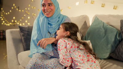 An Emirati mother and her daughter share laughter and joy as they play together, making beautiful memories at home.