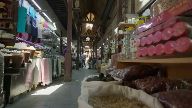 Emirati men in traditional white kanduras walk through the covered Dubai Souk, passing shops filled with spices, fabrics, and household goods. A cultural scene highlighting heritage and daily life in the UAE.