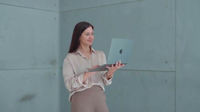 Medium shot of a confident professional woman standing in a minimalist office space, holding and using her laptop. The modern setting and soft neutral tones convey professionalism, focus, and productivity — ideal for business, technology, or lifestyl