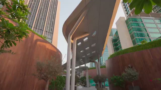 A futuristic pedestrian walkway in Dubai surrounded by modern glass buildings and landscaped greenery. The sleek canopy design adds a contemporary touch to the urban setting, highlighting the city’s innovation in architecture.