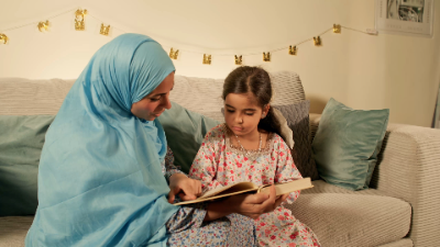 With warmth and care, an Emirati mother helps her daughter with her Quran recitation, guiding her through every verse.