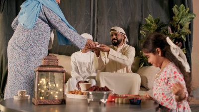 An Emirati family gathered after Iftar to enjoy traditional Emirati coffee and sweets. The mother offers her husband a cup of coffee while the family interacts with each other sharing smiles and love.