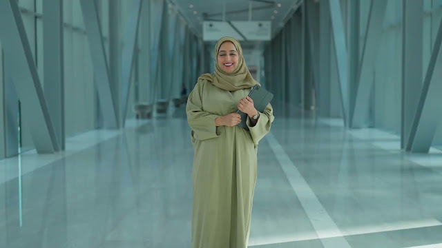 A confident Emirati woman stands in a sleek, contemporary office hallway, holding a tablet and smiling warmly. Dressed in an elegant abaya and hijab, she embodies professionalism and empowerment within the UAE’s modern business landscape.