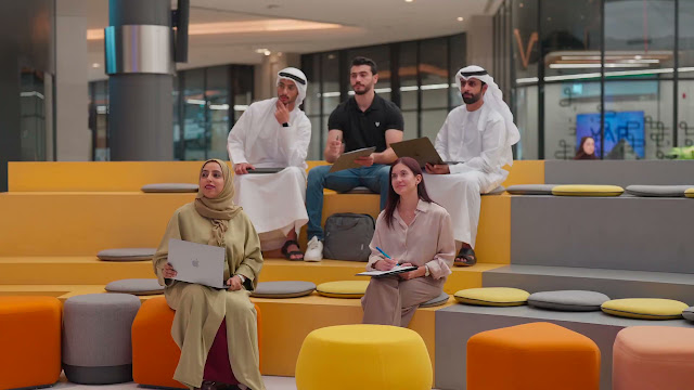 A diverse group of Emirati and international professionals sits together in a modern, collaborative workspace. They are engaged in discussion and note-taking, symbolizing teamwork, innovation, and creative brainstorming in a contemporary office setti