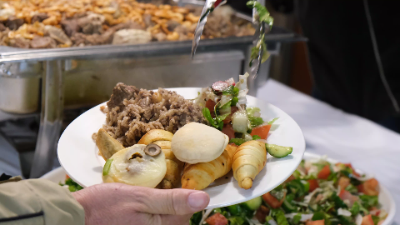 Man holding a food plate at a buffet whilea chef is putting fattouch salad in the plate